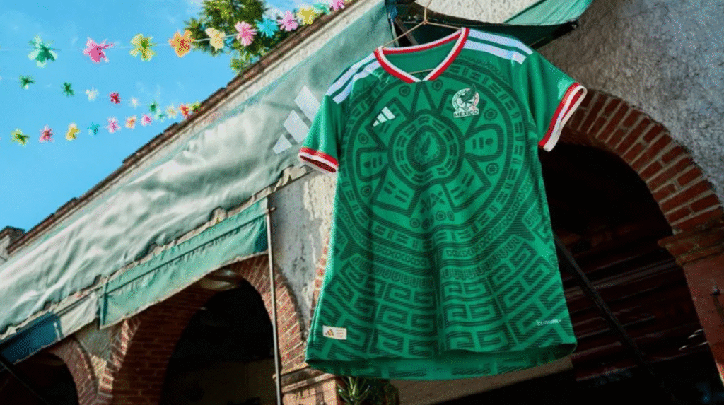 El jersey, que tiene al frente una representación de la piedra del sol, también llamada calendario azteca, “está inspirado en la pasión mexicana que no se apaga y en la fuerza con la que se defienden estos colores”.